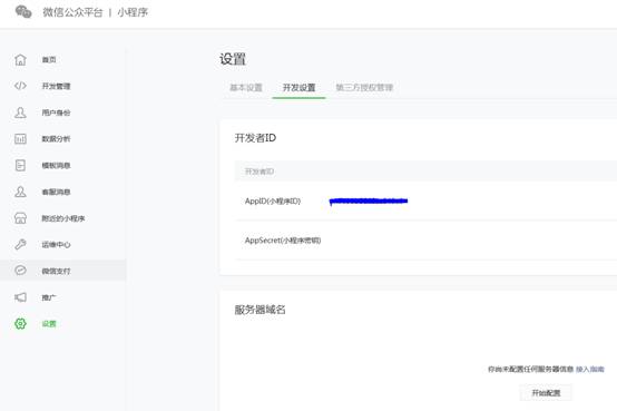 2、在“設(shè)置-開發(fā)設(shè)置”里,配置好服務(wù)器域名