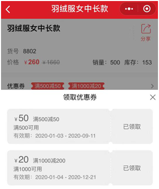 去庫存賣貨少不了營銷活動,活動推廣就需要預熱,讓用戶提前知道。我們可通過把商品或小程序店鋪海報分享到社群、微信朋友圈、群發(fā)好友等通知用戶,用戶點擊即可進入小程序商城店鋪購買促銷熱賣商品領(lǐng)取優(yōu)惠券。